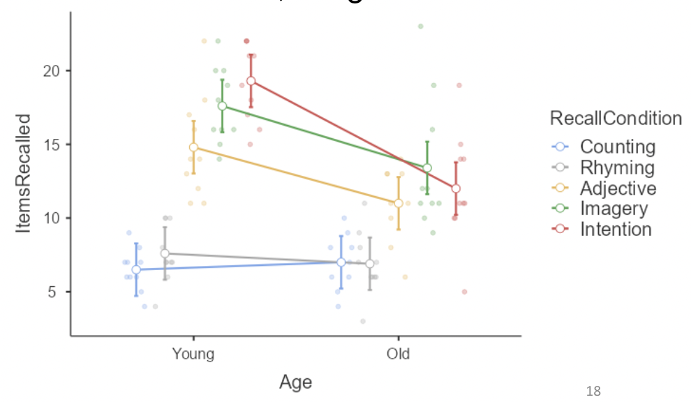 • Notice that the slope for Age (“Old – Young”) is 0.5, suggesting greater recall for older participants.