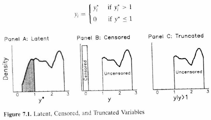 Log Likelihood Function \[LL(\beta,\sigma)=\sum_{c>y} \frac{1}{\sigma}\phi(\frac{y_i-X_i'beta}{\sigma})+\sum_{c<y} 1-\Phi(\frac{c-X_i'beta}{\sigma})\]