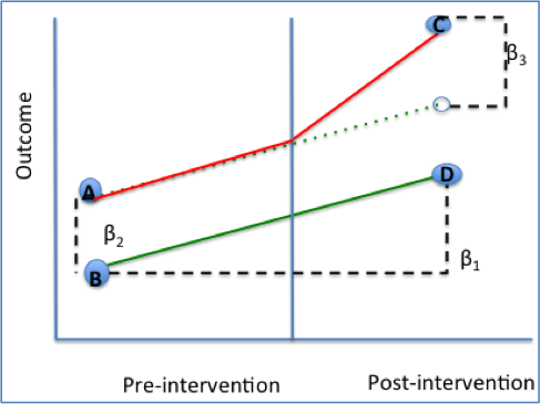 DiD is a combination of time-series difference (compares outcomes across pre-treatment and post-treatment periods) and cross-sectional difference (compares outcomes between treatment and control groups).