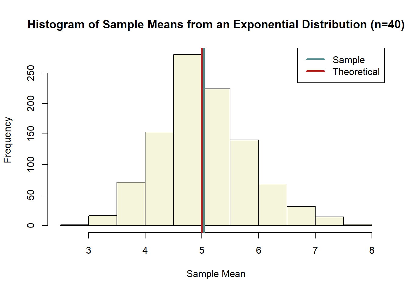 Here we take a random sample of size 40 from the exponential distribution, then we calculate the mean. We do this 1,000 times. Then we graphed a histogram of these 1,000 sample means. Notice, that the graph no longer looks like the original exponential. If any thing, it should look like a normal distribution. Also notice that the average sample mean across the 1000 observations is very close to the theoretical mean of the original exponential distribution.
