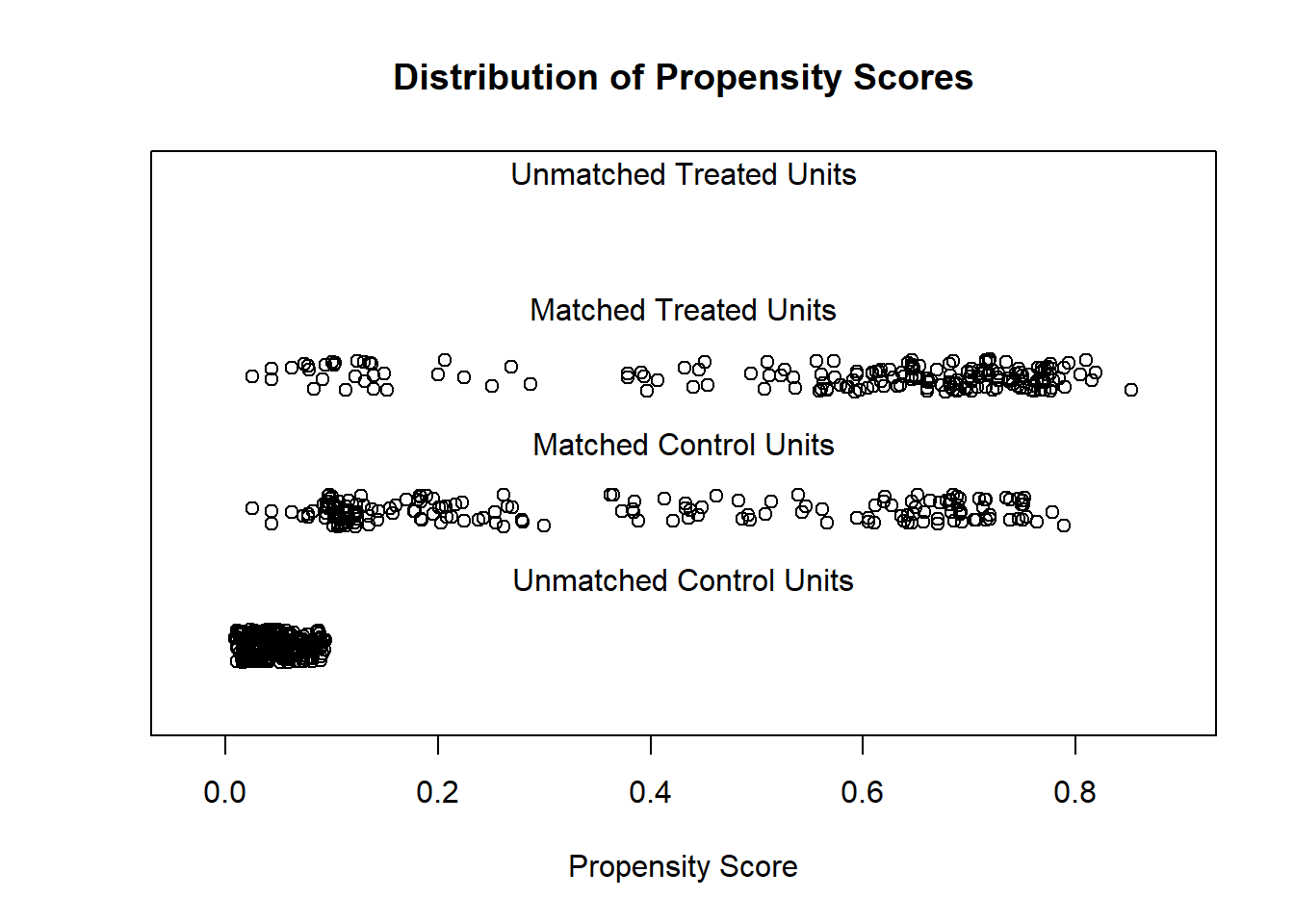 - For example, if someone in the treatment group has a predicted probability of receiving treatment equal to 0.5, then we would like to match that person with someone who has a predicted probability close to 0.5, but who did not receive the treatment.