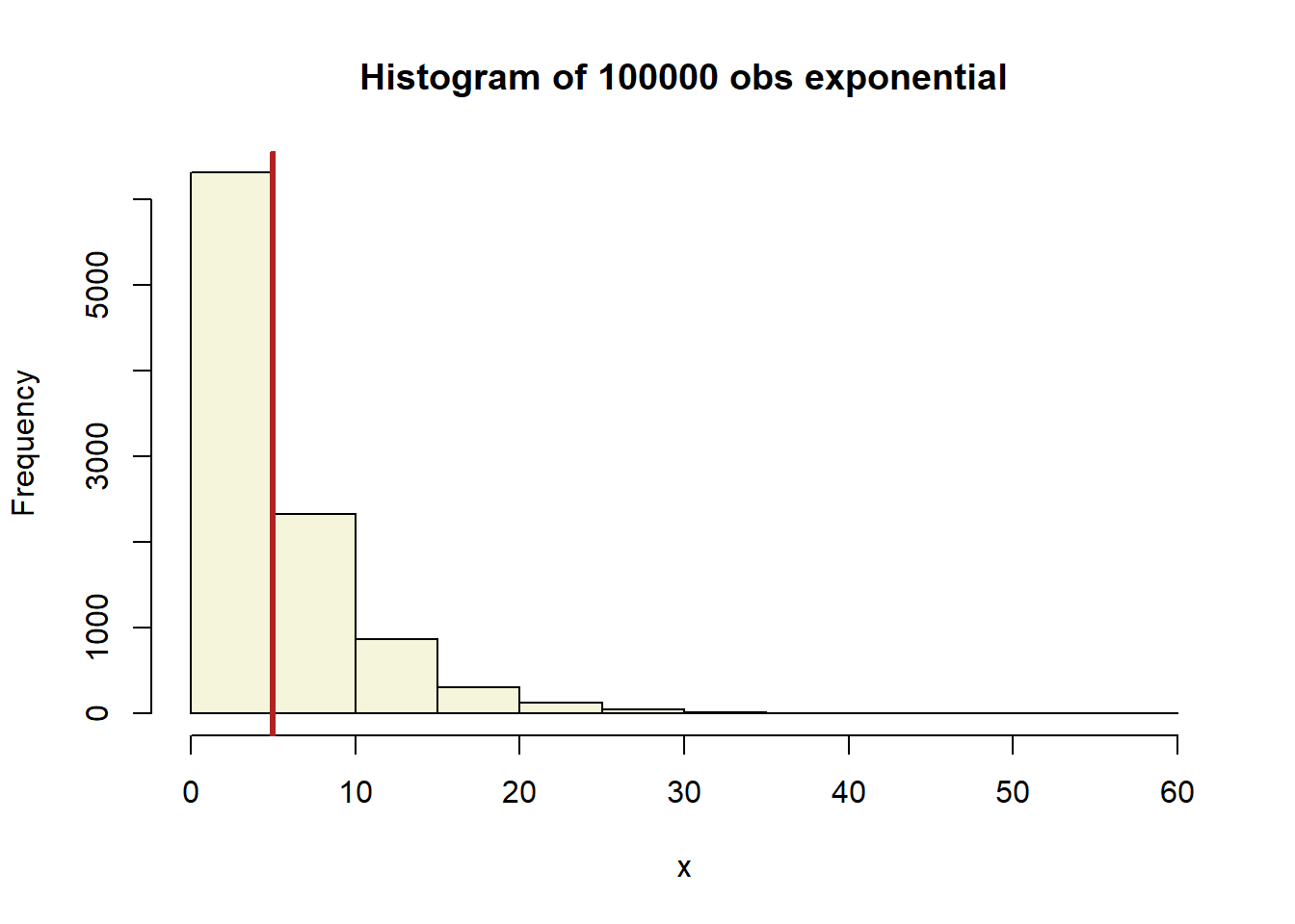 The Central Limit Theorem (CLT) says that the sample means from almost any distribution will be approximately normally distributed. Here we show an exponential distribution with a mean of 5. We used 10,000 draws from an exponential distribution to make this histogram.