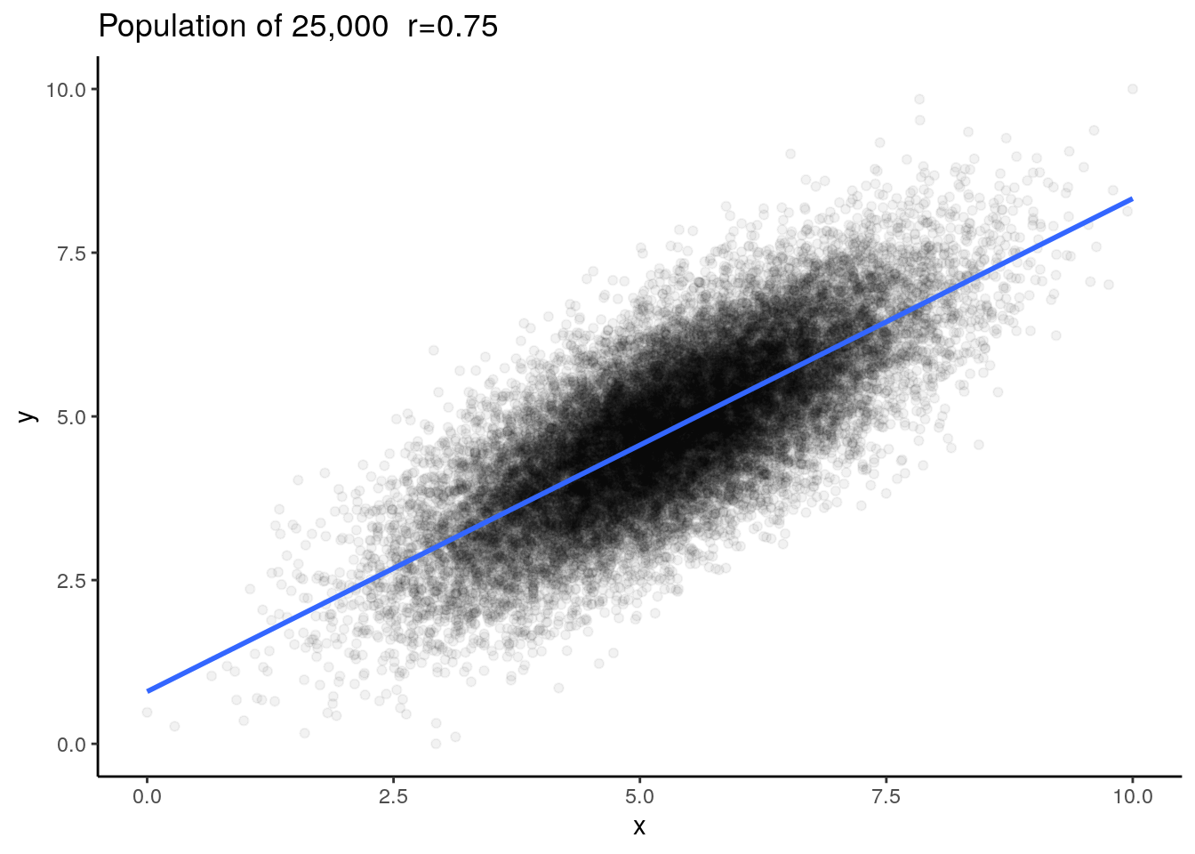 The below image shows scatterplots, each with a sample size of 30. The trendline is to help demonstrate how correlations of different magnitudes look in terms of their association.