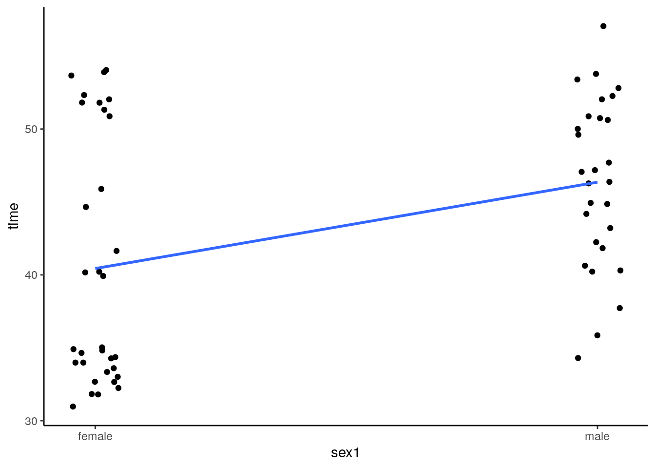 What we have in this plot are individual points representing each cat. The points are jittered to make overlapping datapoints more readable. We have also put a trendline through the data. How was this achieved? Essentially, all the females are given the value 0, and all the males are given the value 1. We then run a Pearson’s correlation using the X values to be 0 or 1, and the Y values to be the time measurement.