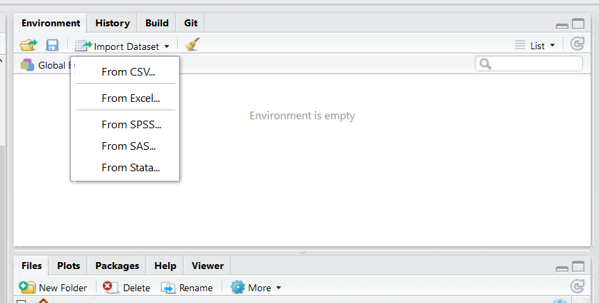 Option 1. Import Tab You can click on the “Import Dataset” tab in the top right of RStudio - it’s located just above your global environment.
