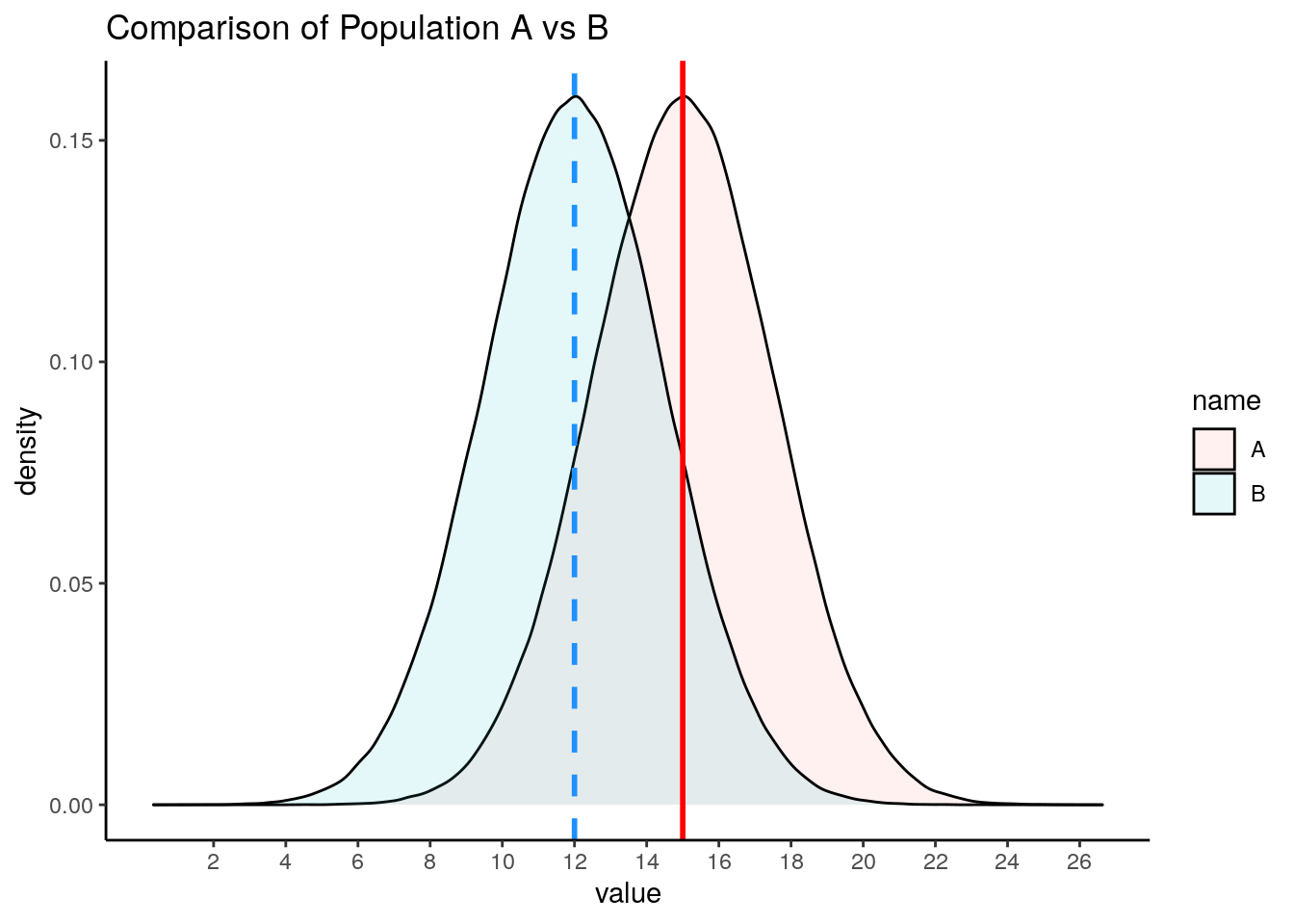 Say we have two normally distributed populations, A and B and each has 500,000 subjects. A has a population mean \(\mu = 15\), and a population standard deviation \(\sigma = 2.5\). B has a population mean \(\mu = 12\), and a population SD \(\sigma = 2.5\).