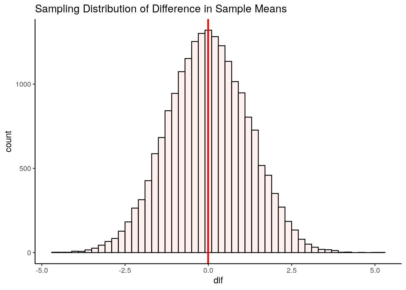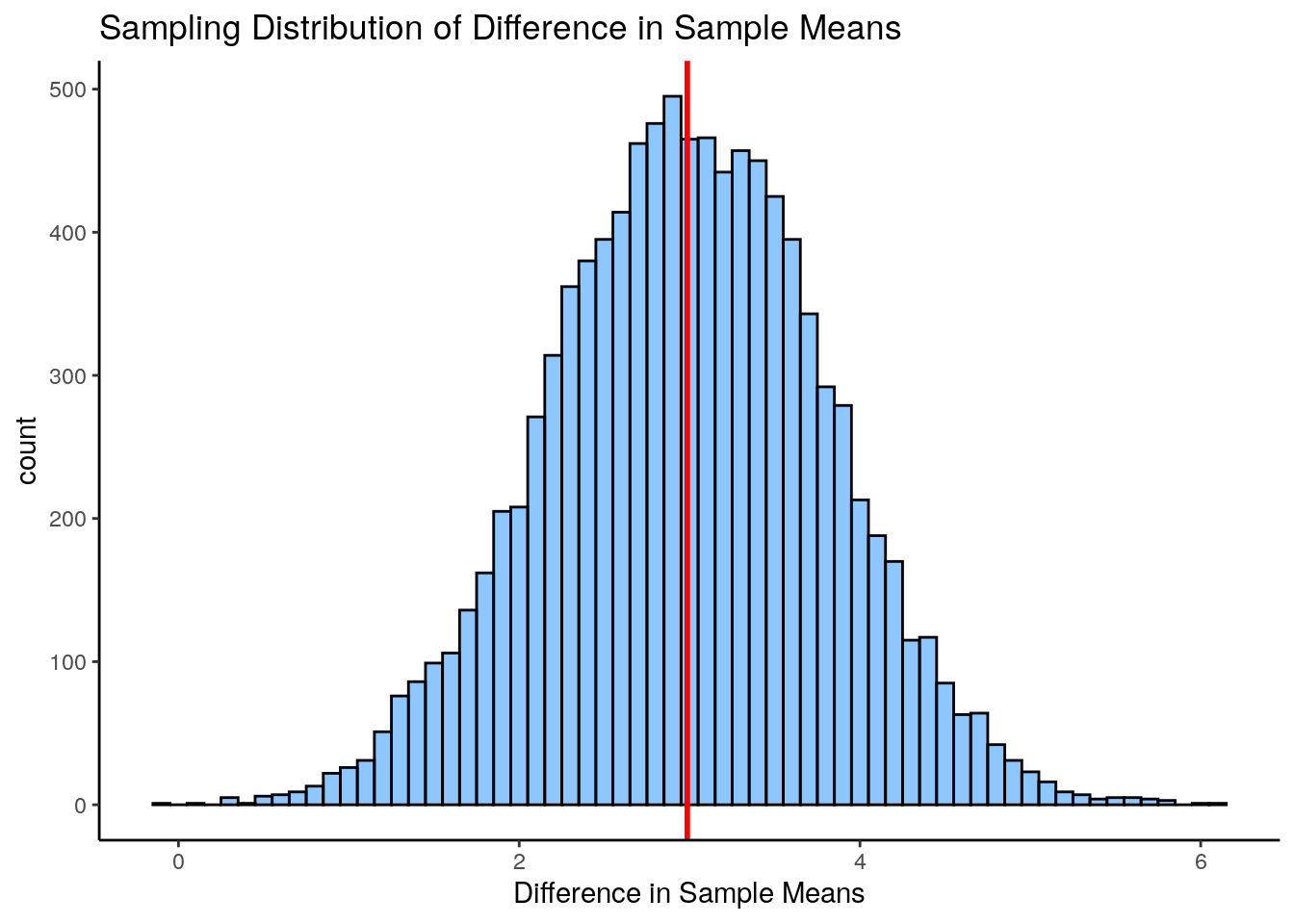 As you can see, the sampling distribution is approximately symmetrical. If we ran it for more simulations, it would become even more symmetrical. The average (mean) difference in sample means across all samples is \(\Large \mu_{\overline{x}_{A} - \overline{x}_{B}}= 2.987\) which is approximately equal to the real difference in population means \(\mu_{A} - \mu_{B}\).