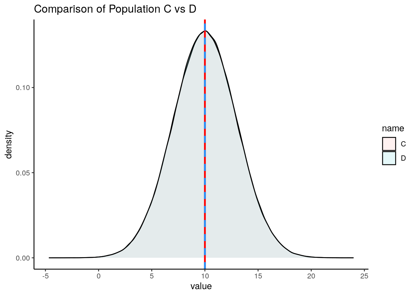 We can then calculate the true difference between these populations in their population means and see that \(\mu_{C}-\mu_{D} = 0.00\)