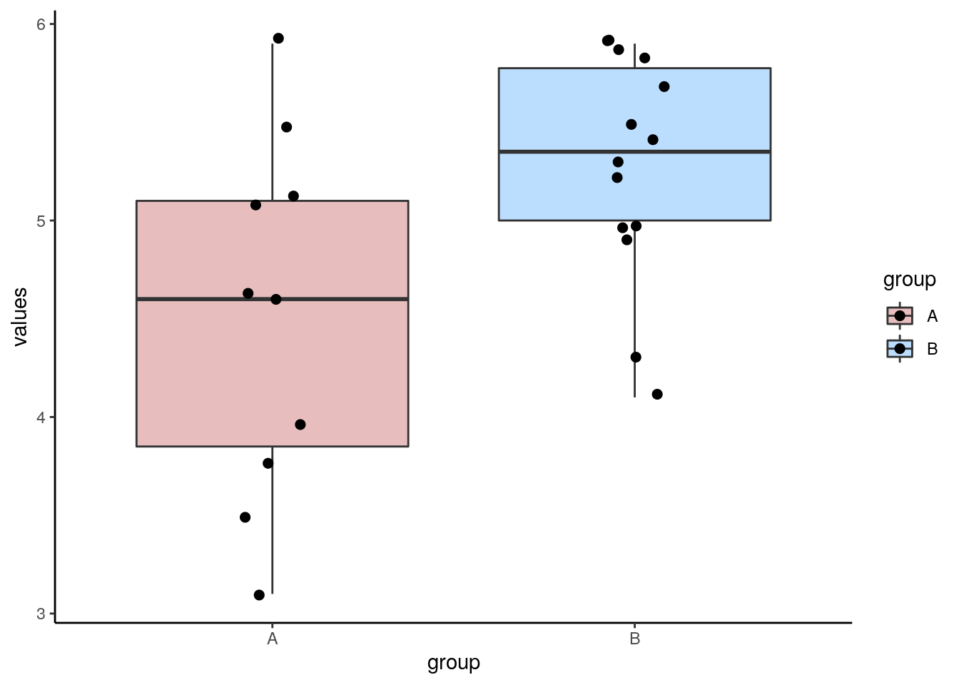 The default is to run a 2-tailed test. You are given a test-statistic \(W\) and a p-value. Here, \(p=0.0191\) which indicates that our two samples have significantly different medians. With this test, you will get a warning about not being able to compute an exact p-value with ties. This isn’t really important and can be ignored. In fact, you can turn it off by using the following: