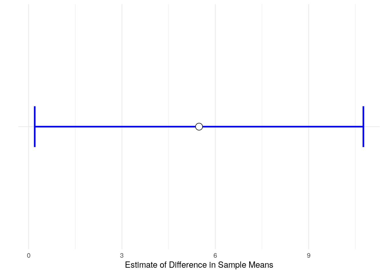 For a two-sample independent \(t\)-test, the sampling distribution we use is different to the sampling distribution for a one-sample \(t\)-test. In a one-sample test, we are focused on the sampling distribution of sample means. In a two-sample test we are focused on the sampling distribution of the differences in sample means.