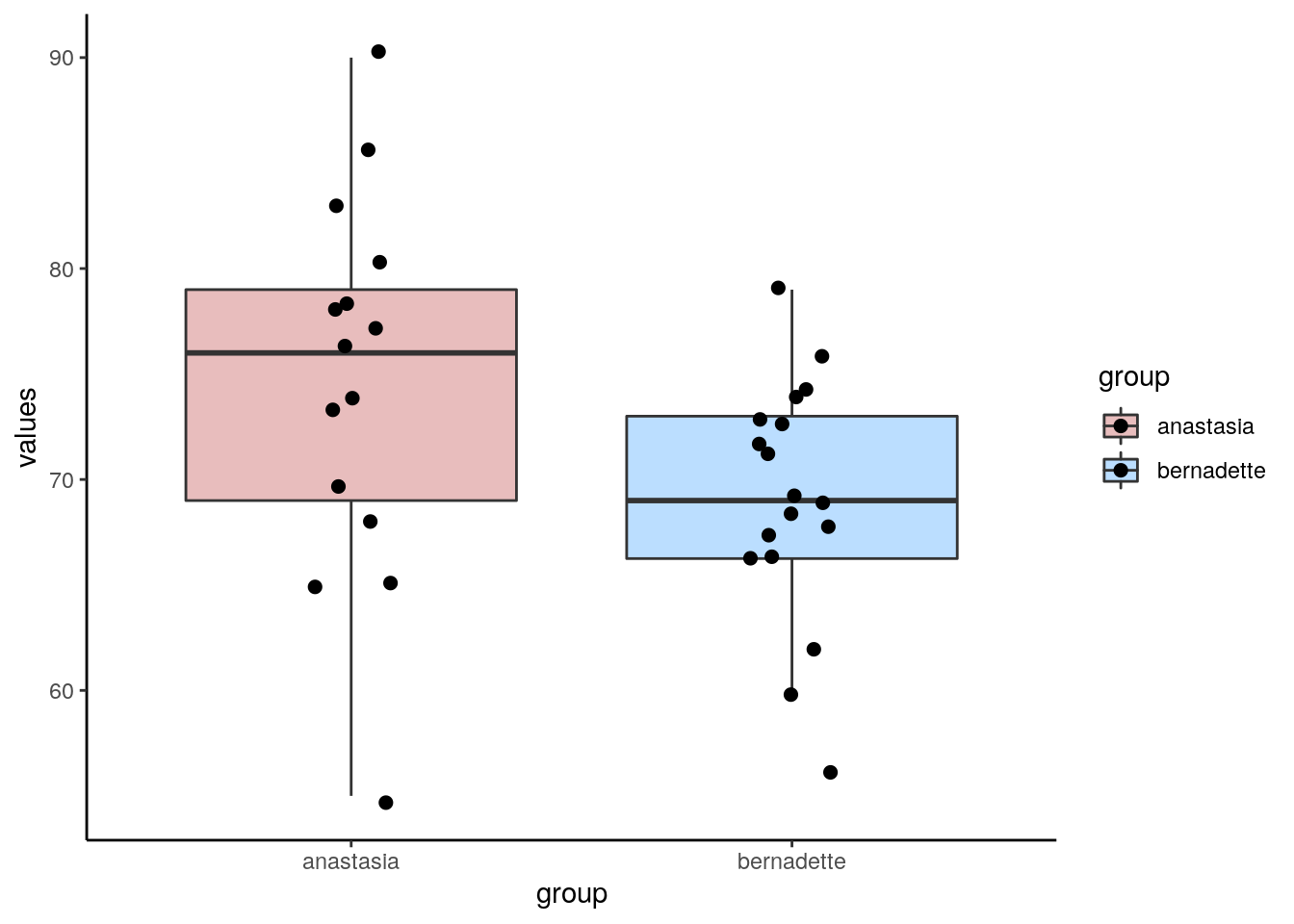 drug <- c(15, 15, 16, 13, 11, 19, 17, 17, 11, 14, 10, 18, 19, 14, 13, 16, 16, 17, 14, 10, 14)We can put these into a dataframe: