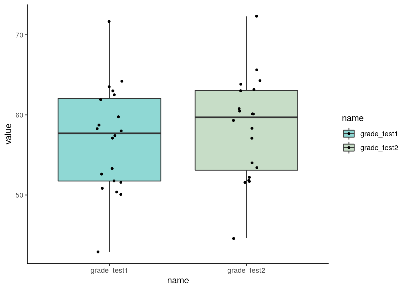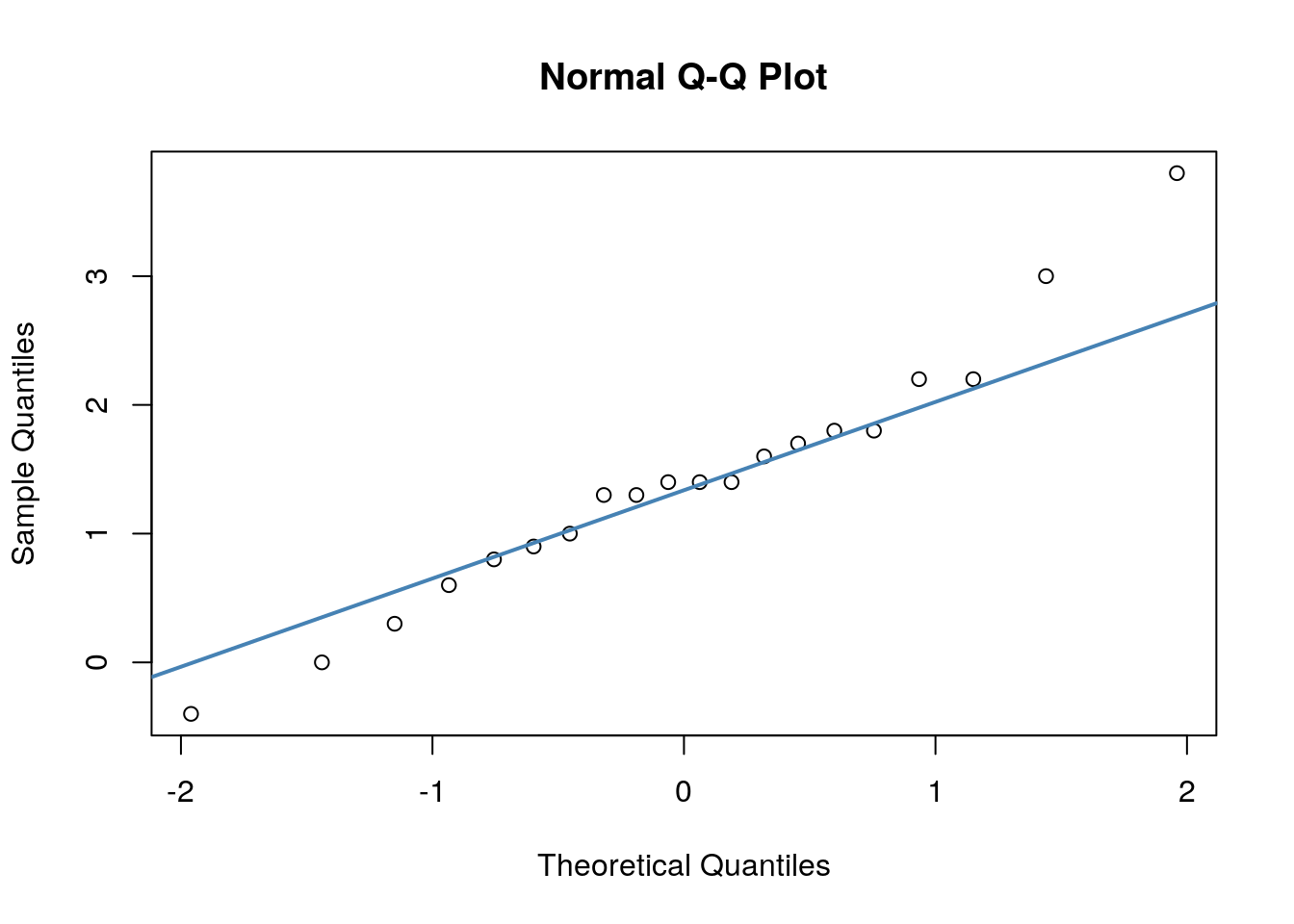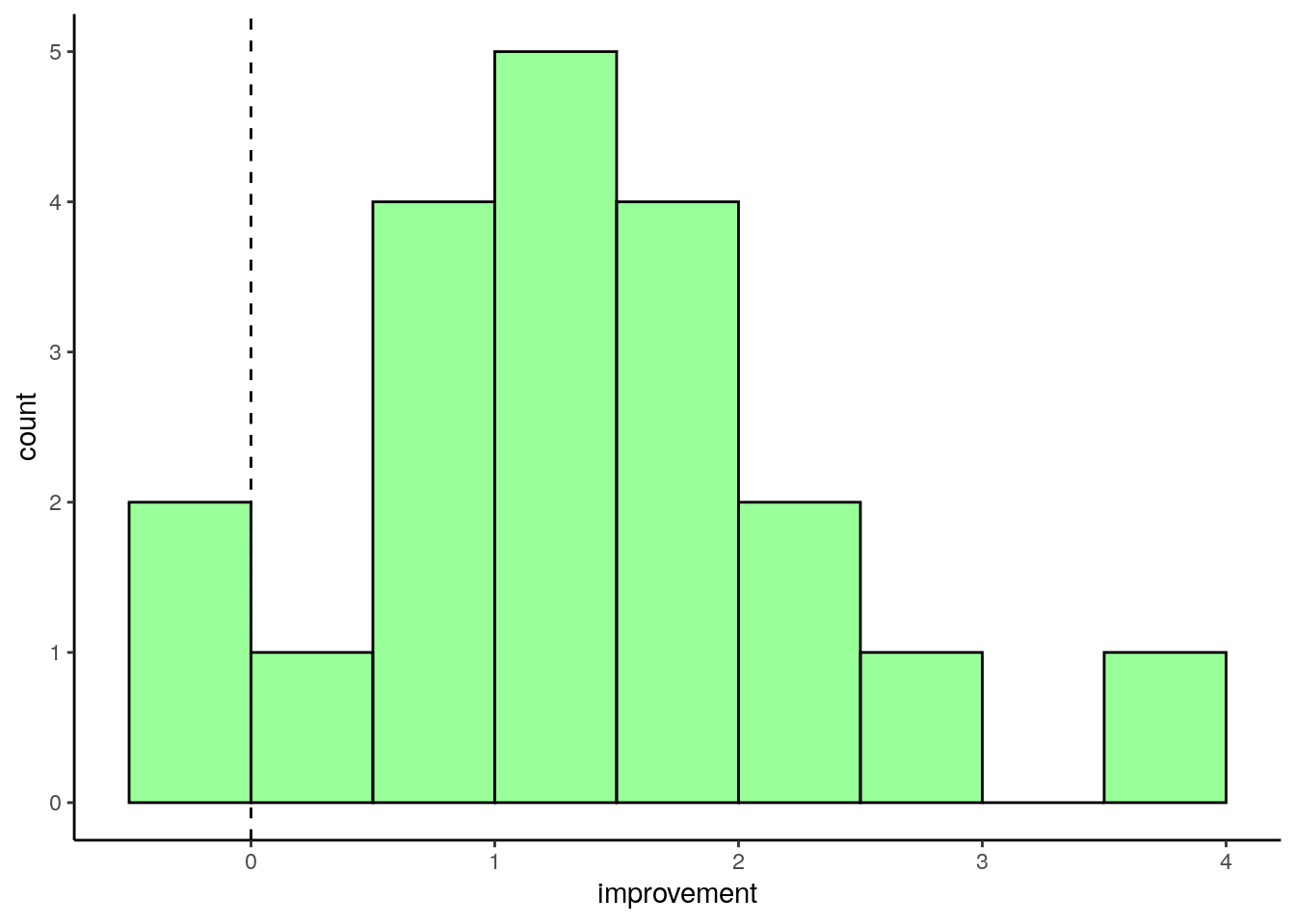 This gives us confidence intervals of the population median in differences cores of -0.135[-1.162, 0.137] which includes 0 and therefore suggets that there is no difference in medians between the paired groups. The p-value confirms this being \(p=0.54\). The \(V\) value is the test-statistic.