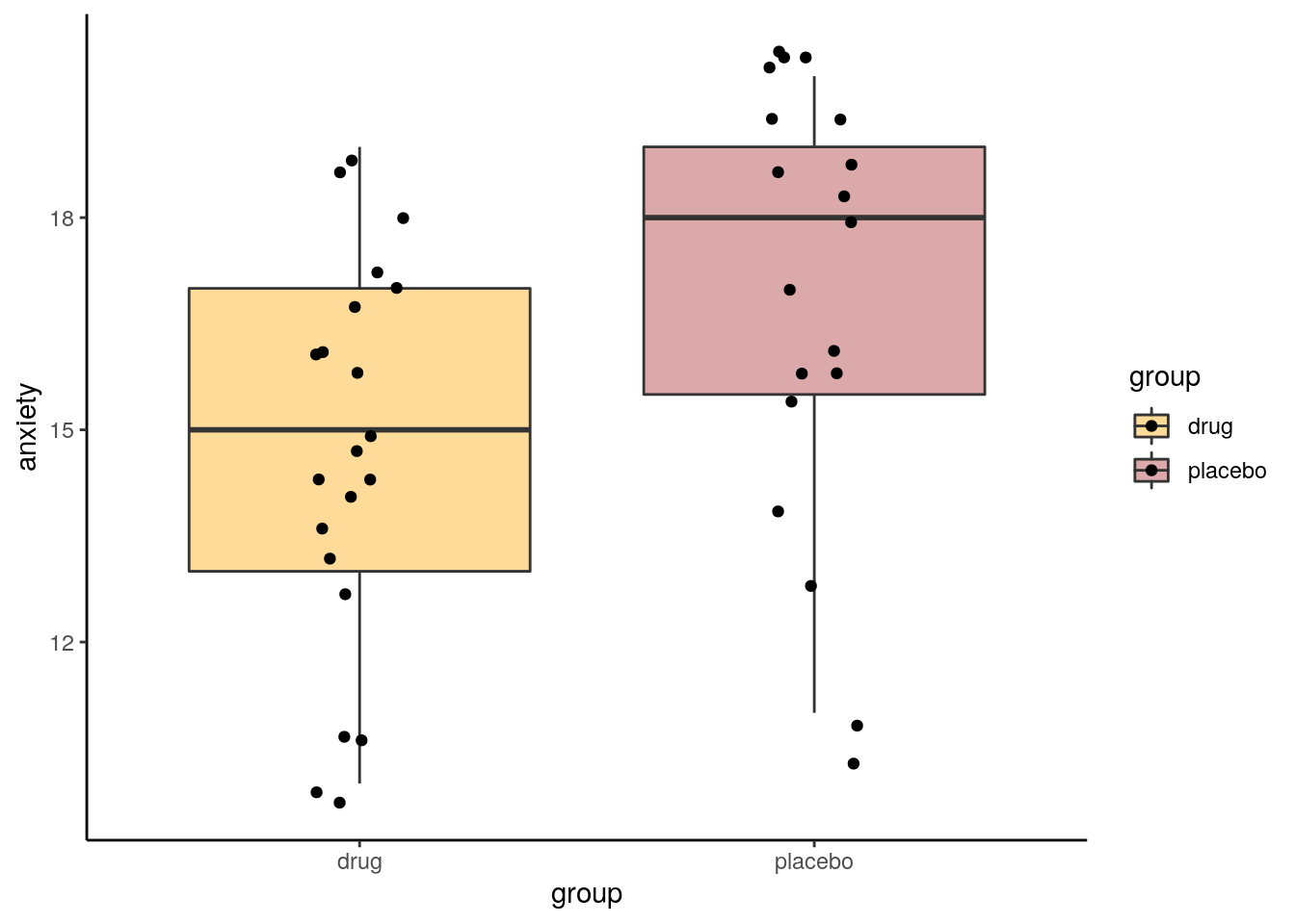 Looking at these data, it seems that the anti-anxiety drug group does have subjects with generally lower overall anxiety scores than the placebo group. A logical next step would be to think about doing an independent t-test.