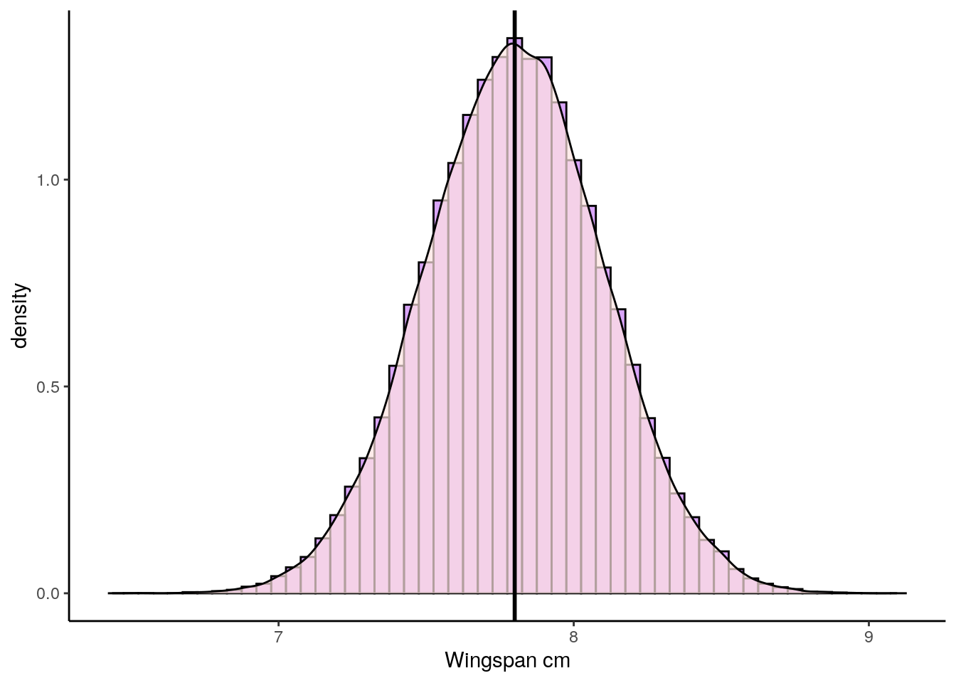 Let us imagine we have a population of butterflies and we’re interested in their wingspan. The population is normally distributed with a population mean \(\mu = 7.8cm\), with a population standard deviation \(\sigma = 0.3cm\). This is what this population distribution looks like: