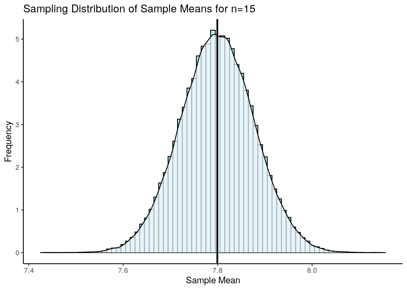 If we did this thousands of times, then we’d get our sampling distribution of sample means (see section 7.0.3). This is what our sampling distribution for sample sizes of \(n=15\) looks like: