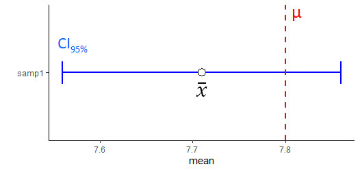 Below is a graphical representation of our confidence interval around our sample mean \(\overline{x}\). You can see that the true population mean \(\mu\) is within the confidence interval.