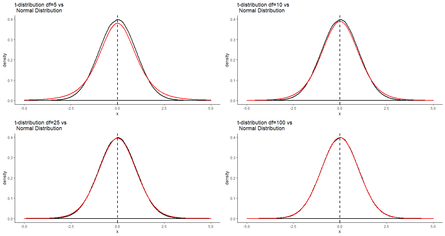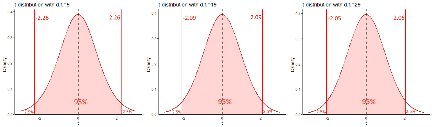 When we collect samples of different sample sizes, two things change in the \(t\)-distribution confidence interval formula. Firstly, the value of \(t\) used is dependent upon the degrees of freedom. As sample sizes increase, the \(t\)- distribution becomes more normal shaped and less heavy in the tails. If, for example, we are interested in making 95% Confidence Intervals, then the value of \(t\) that leaves 2.5% in each tail (and 95% of the distribution in the middle) is going to get closer to 1.96 (and negative -1.96) as the sample size increases. This is illustrated in the figure below: