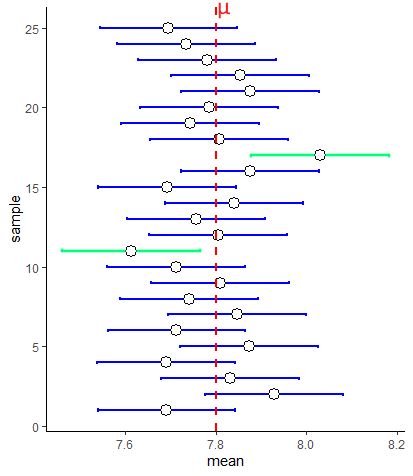 What if we collected 25 new samples, and calculated 25 sample means, and made 25 confidence intervals? Well, the chart below shows 25 95% confidence intervals collected from samples of size 15 selected at random from our population of butterflies: