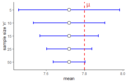 What happens when we get different sized sample sizes? For instance, look at the 95% confidence intervals below that all have a sample mean of \(\overline{x}=7.72\) but are for different sample sizes: