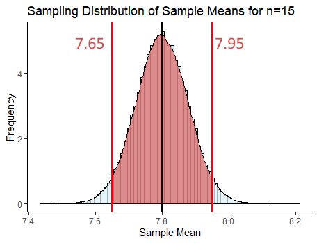So, 95% of our sample means in our sampling distribution lie between 7.65 and 7.95. That area is represented by the shaded red area on our sampling distribution below: