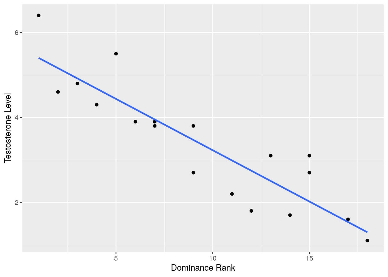 In the following example, the data show the dominance rank, age, body size and testosterone levels for a group of 18 animals. Lower numbers of the ranks, indicate a higher ranking animal. An animal with rank 1 means that it is the most dominant individual.