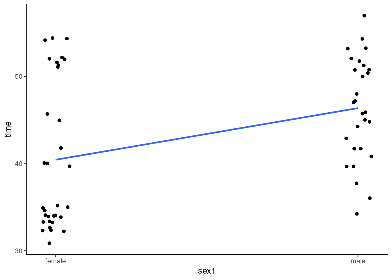 What we have in this plot are individual points representing each cat. The points are jittered to make overlapping datapoints more readable. We have also put a trendline through the data. How was this achieved? Essentially, all the females are given the value 0, and all the males are given the value 1. We then run a Pearson’s correlation using the X values to be 0 or 1, and the Y values to be the time measurement.