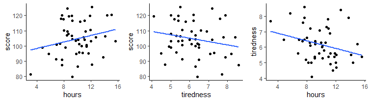 Again, we see that the relationship between these two variables is reduced considerably to \(\rho=0.13\) when we controll for each of their relationships with anxiety.