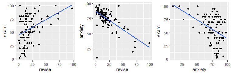 For example, let’s examine the Spearman correlations between anxiety, exam score and revision.