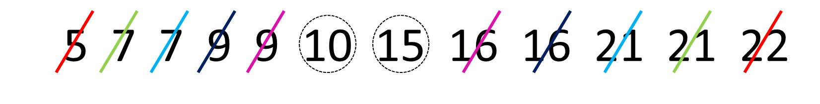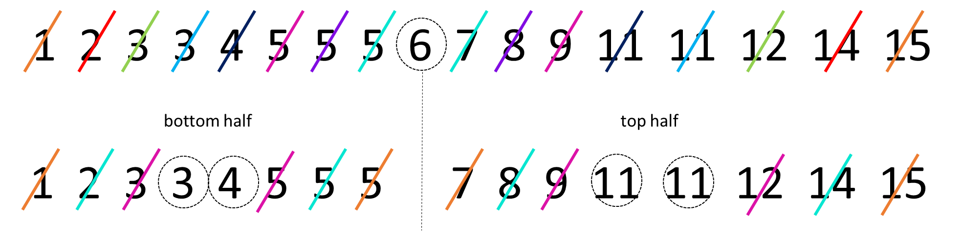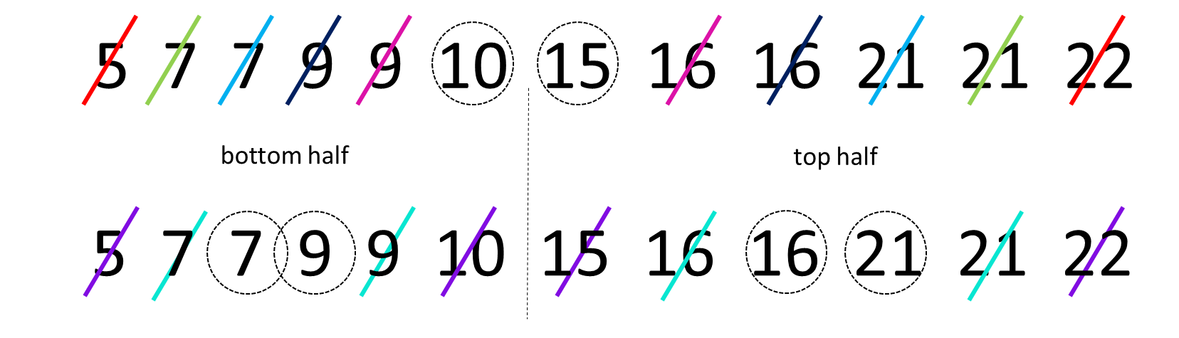 To do this by hand, we would first order the data, and then work from the outside to the inside of the distribution, crossing off one from each end at a time. The image below shows how we’re doing that using different colors to show the crossing out:
