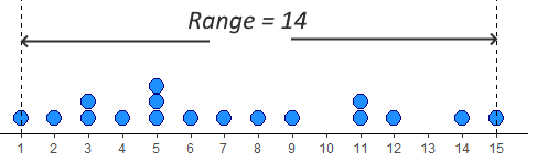 The simplest measure of spread is the range. This simply is the difference between the minimum and maximum value in a dataset. Looking at our distribution x, the minimum value is 1, and the maximum value is 15 - therefore the range is \(15-1 = 14\).