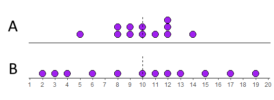 Look at the two distributions below. Both of them have means of 10. The top distribution (A) however is much more clumped than the bottom distribution (B) which is more spread out.