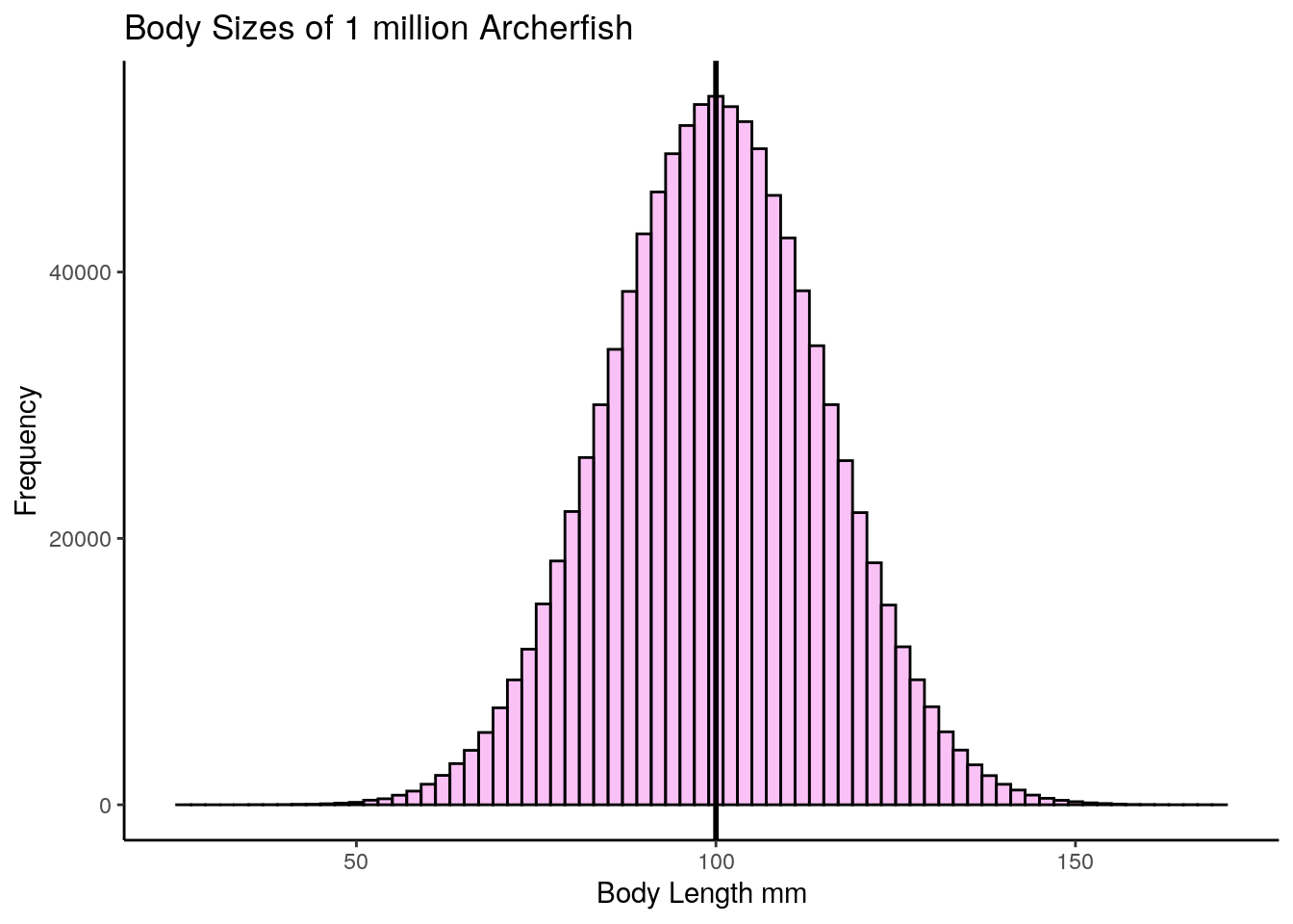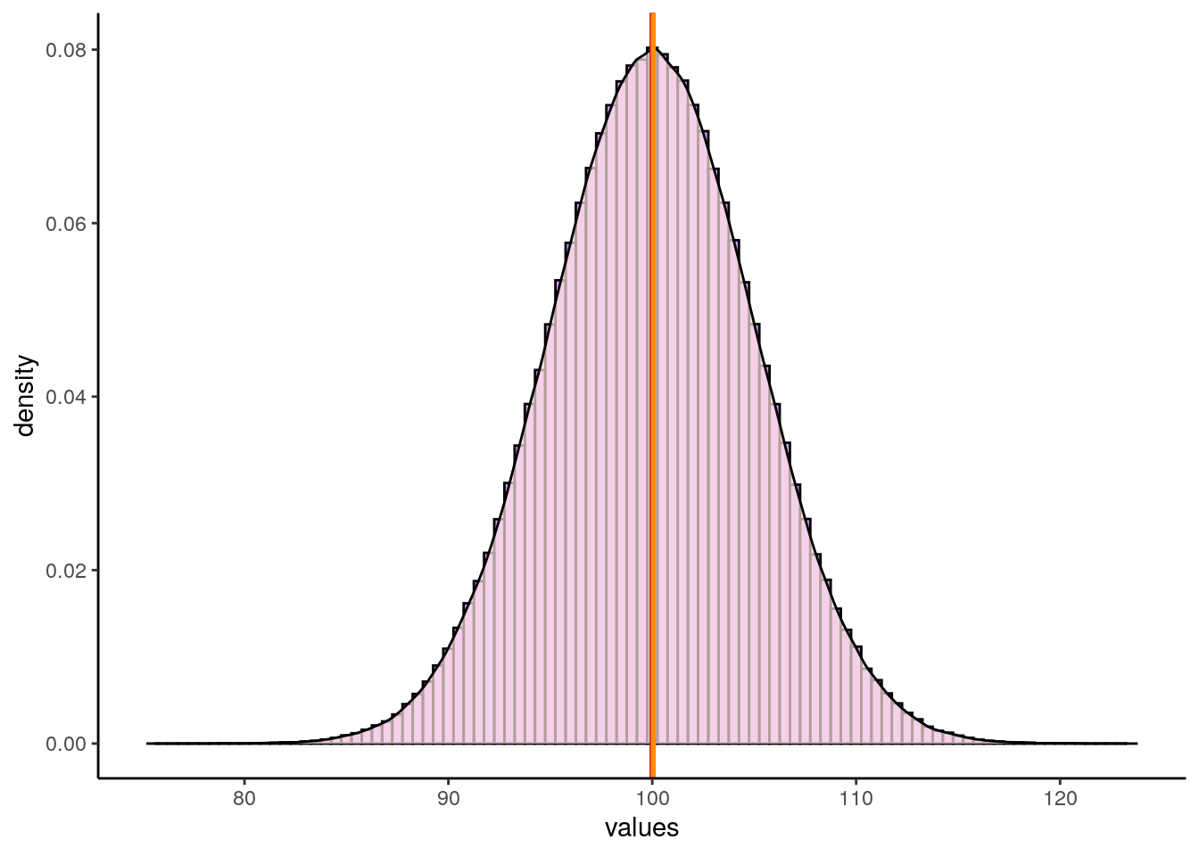 Let’s look at a normal distribution. The following normal distribution has a mean of 100 and a standard deviation of 5. We can generate it by collecting 1,000,000 datapoints in R: