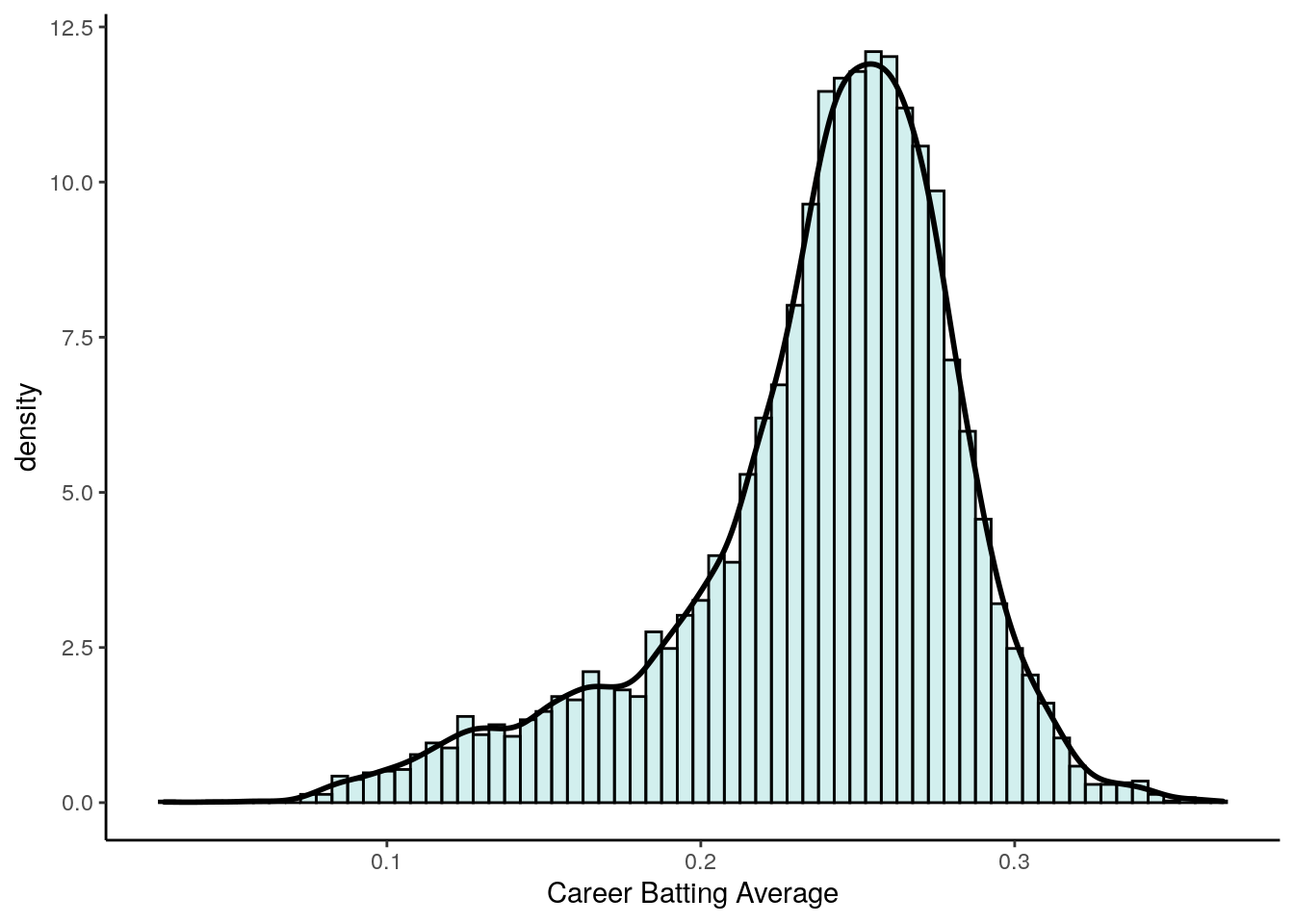 As you can see, this distribution is very negatively (left) skewed. This means that there are many players who have career batting averages between 0.2 and 0.3. There are relatively few players with career averages over 0.3. There are more averages that are less than 0.2 causing the skew.