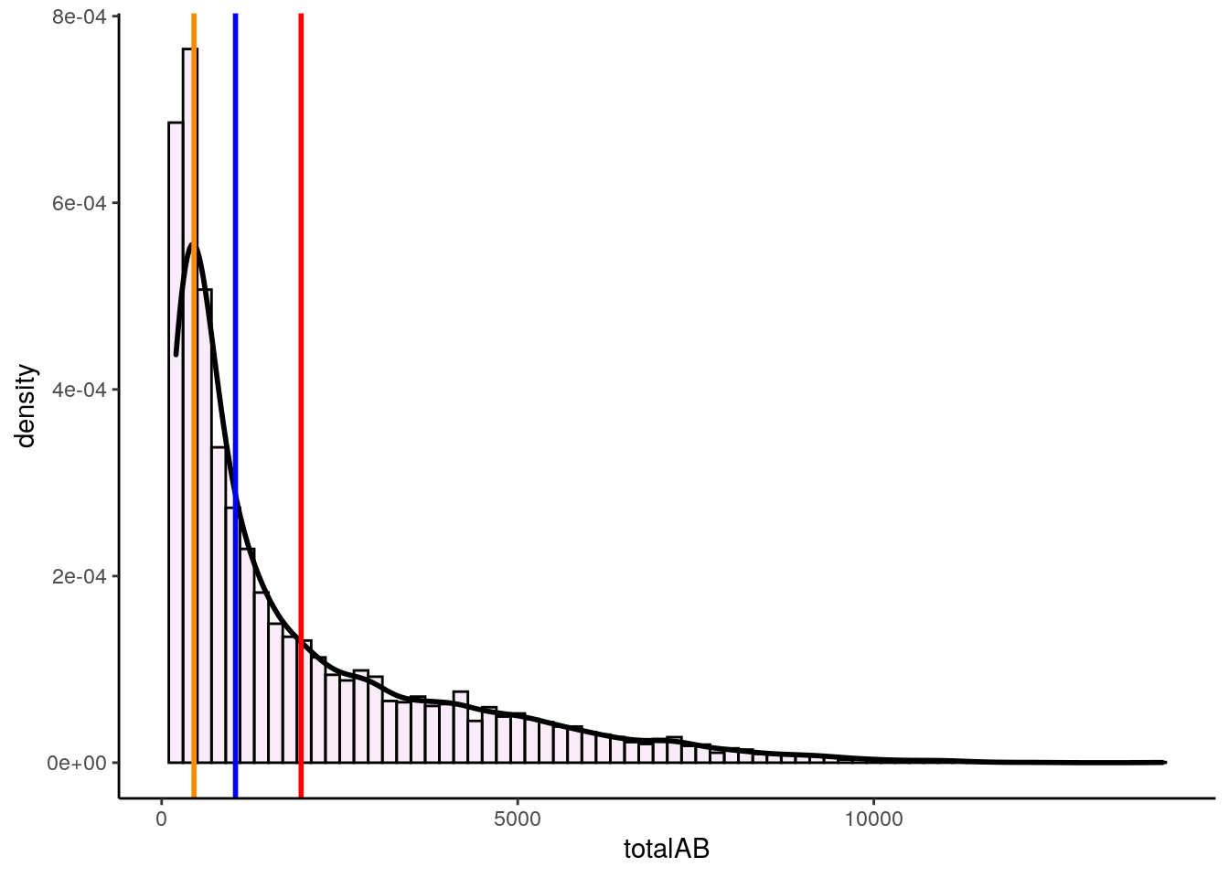 geom_vline(xintercept = estimate_mode(x), color = "darkorange", lwd=1)