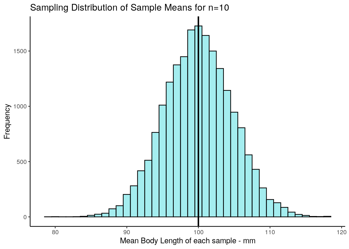 \(\mu_{\overline{x}} = 7.5\) which is once again approximately equal to the original population mean. The sampling distribution standard deviation \(\sigma_{\overline{x}} = 0.799\). We could have directly calculated that using the formula for the standard error, n \(\Large \sigma_{\overline{x}} = \frac{\sigma}{\sqrt{n}}\), as we know the original population standard deviation: