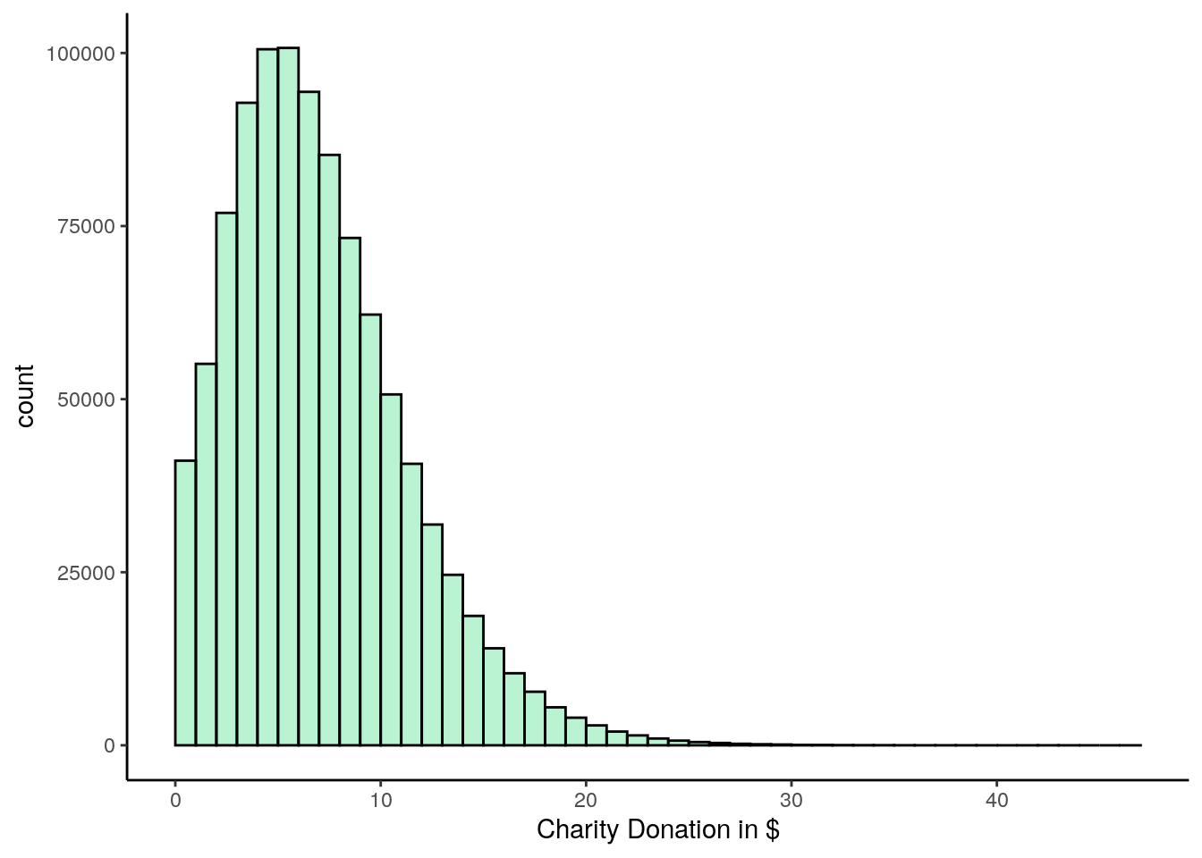 We can see that the central limit theorem holds true for skewed distributions also. Here, we have a population of 1 million charity donations. Let’s draw a histogram of the population distribution and calculate the mean and standard deviation of the population.