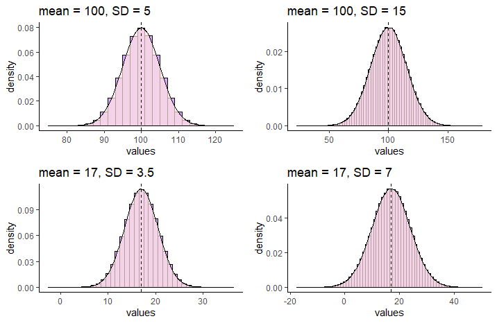 Normal distributions can vary in their means and standard deviations. Below is an image of a selection of four different normal distributions that all vary in their means and standard deviations. The dotted vertical black line in each graph indicates where their respective means lie.