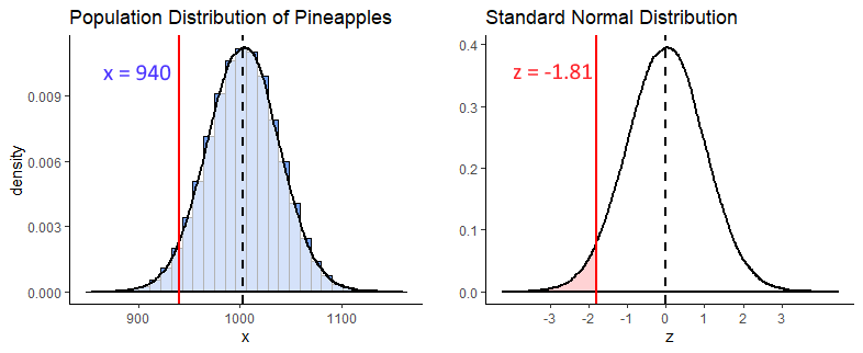 The original question asked what probability there was of getting a sample mean of less than 58g. This is basically what area is under the curve of the above sampling distribution to the left of the 58g sample mean. Because we converted that sample mean of 58g to a z-score of -2.31, we can look at that value on a standard normal curve. The area we are interested in is the filled in area to the left of z = -2.31: