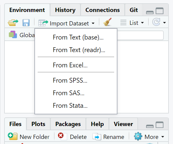 Option 1. Import Tab You can click on the “Import Dataset” tab in the top right of RStudio - it’s located just above your global environment.
