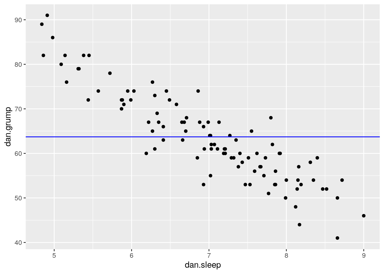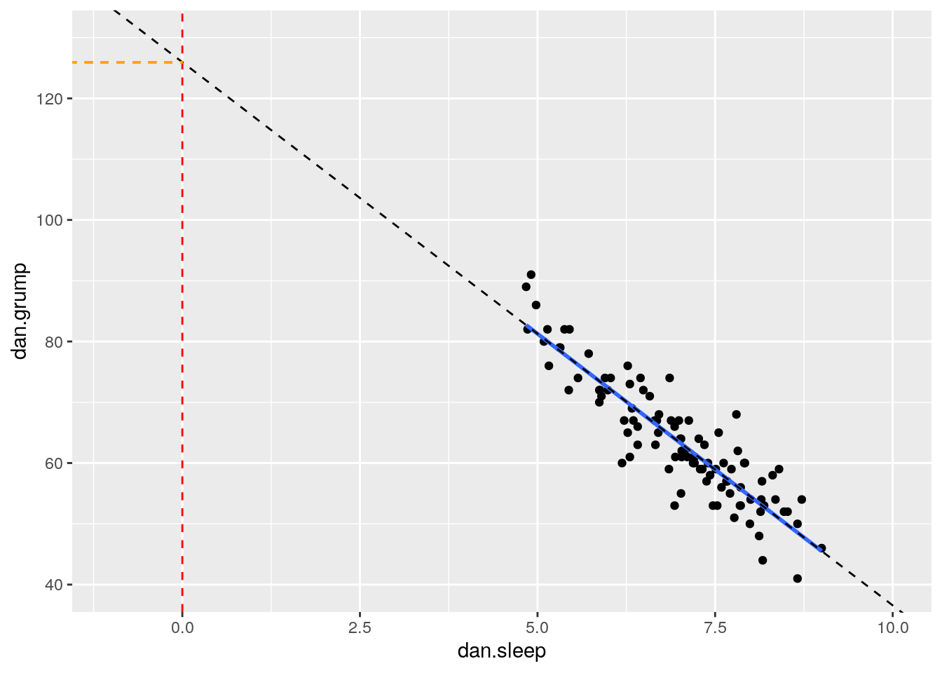## lm(formula = dan.grump ~ dan.sleep, data = df)