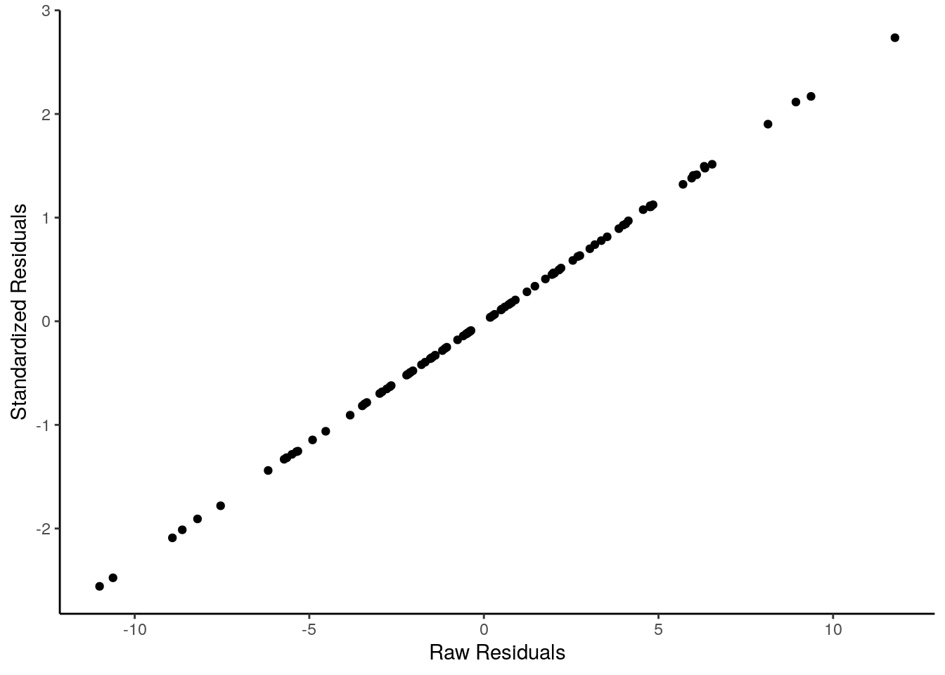 Using our regression line equation of y' = 125.96 + -8.94b, we can manually calculate the raw residuals.