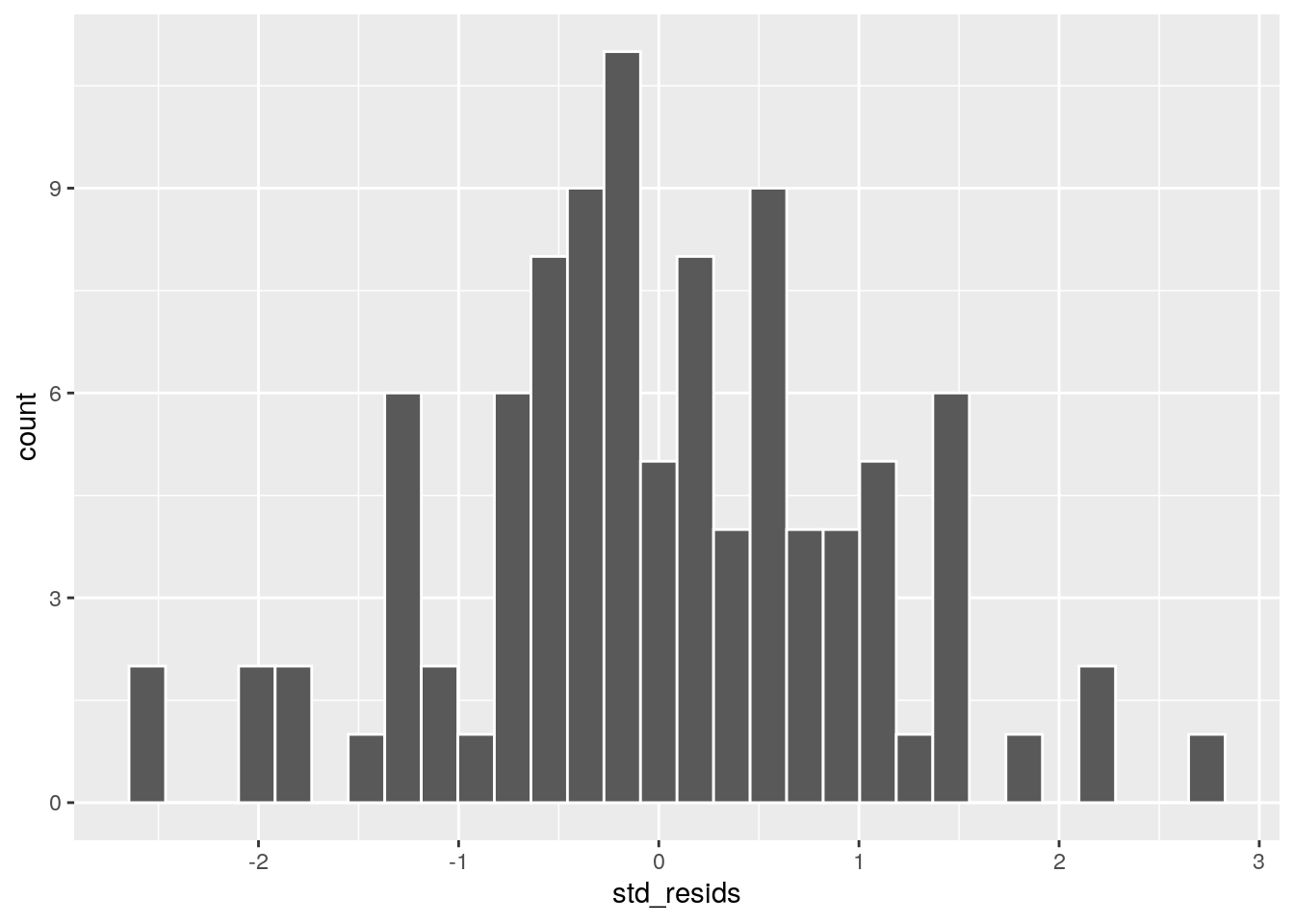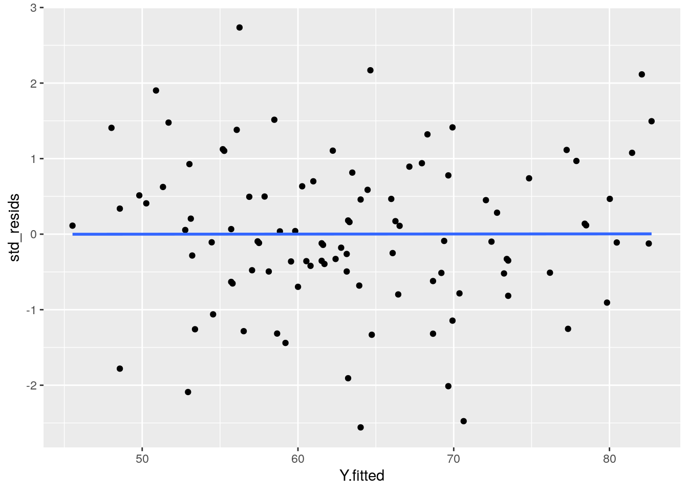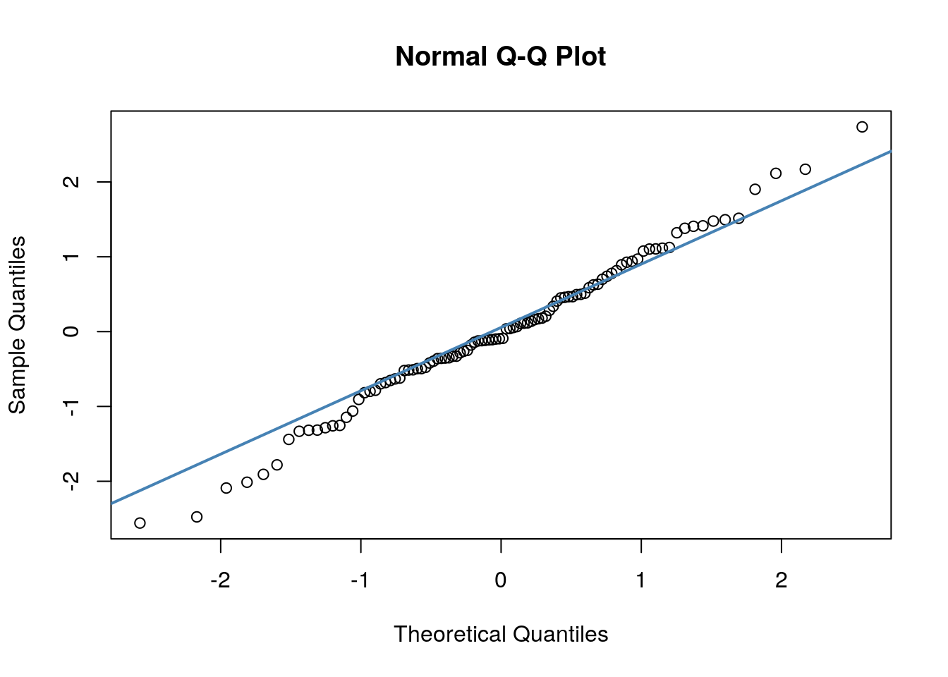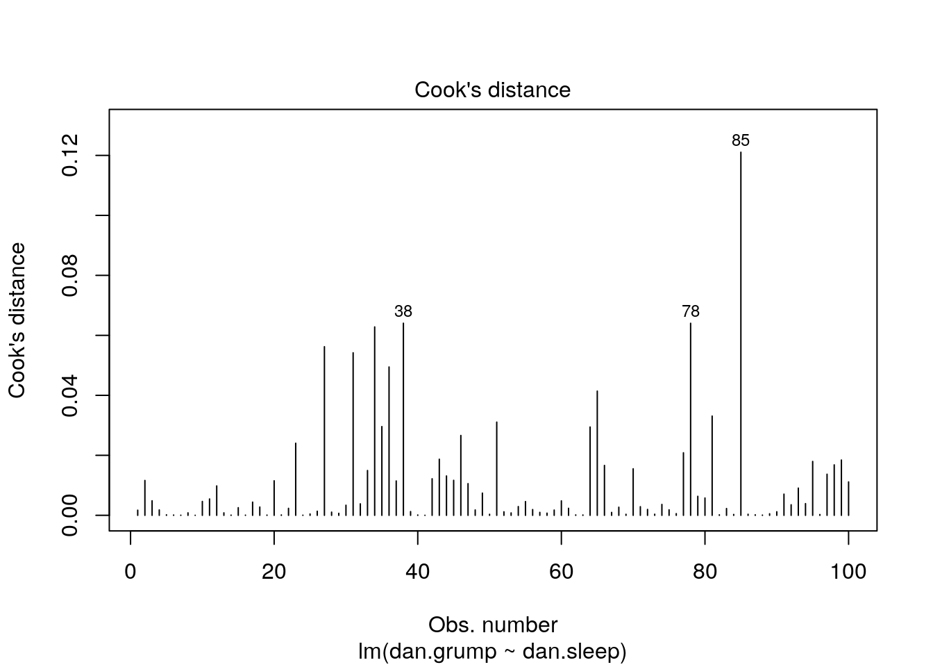 This plot shows each of our 100 datapoints in the order they appear in the original dataframe along the x-axis. Clearly, looking at the y-axis, all our datapoints have Cook’s distances of far below 1, so we are fine to assume that we have no overly influential datapoints.