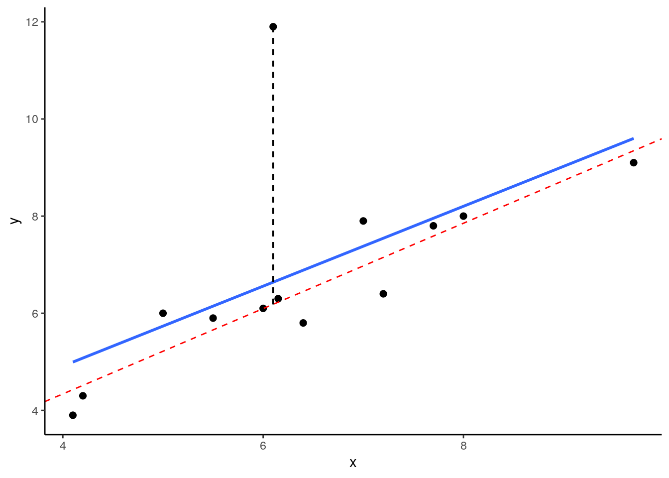 What you can see here is the scatterplot of ‘x’ against ‘y2’. The blue trendline is the best fit line to the regression of ‘x’ against ‘y2’. The red dotted line is the regression line when we remove the datapoint at x=9.7. This datapoint has both high leverage and is an outlier (has an overly large residual). As a consequence of this, when you remove this datapoint it significantly shifts the angle of the slope of the regression line. That means that the value of b changes quite considerably.
