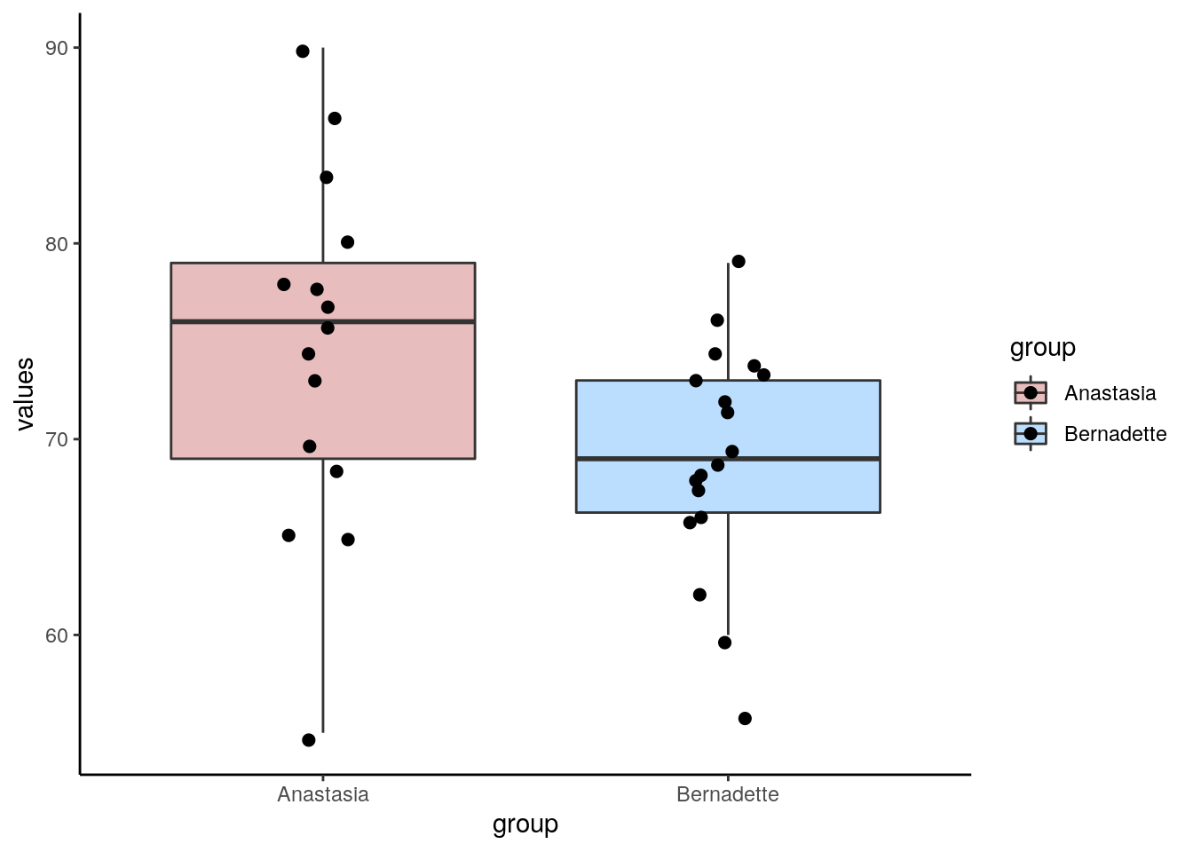 dd <- data.frame(values = c(anastasia, bernadette),