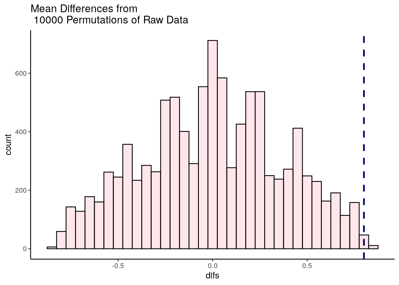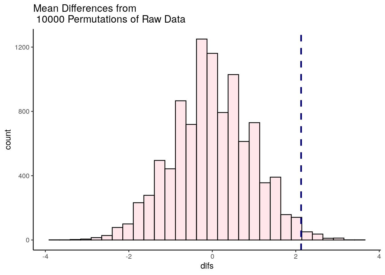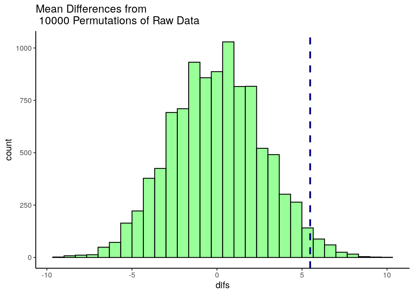 ggtitle("Mean Differences from \n 10000 Permutations of Raw Data")## `stat_bin()` using `bins = 30`. Pick better value with `binwidth`.