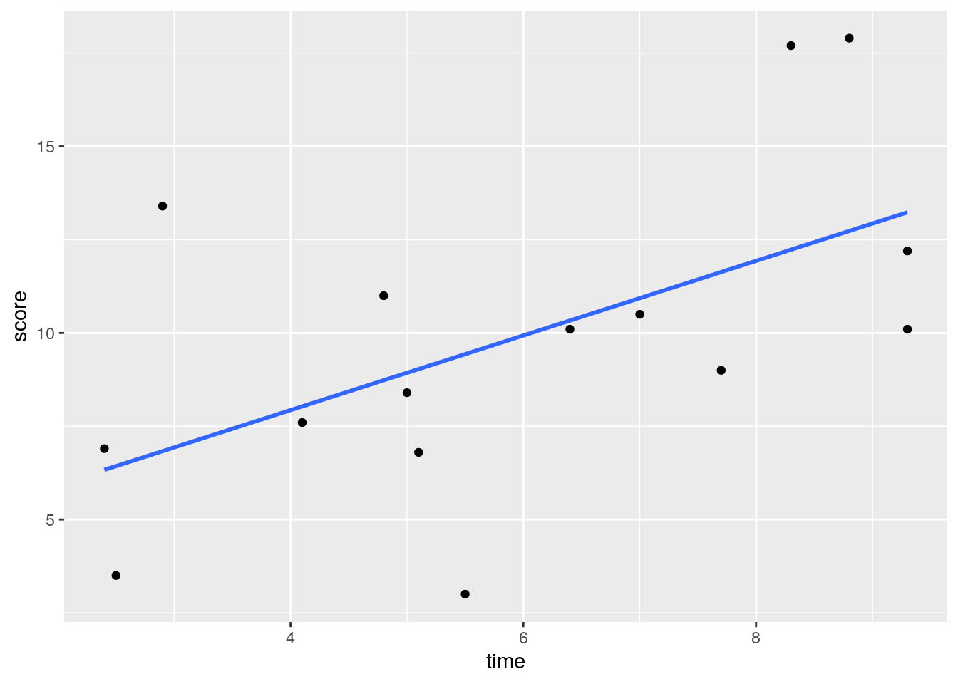 We can use this value as our p-value. Because it is relatively low, we could argue that we were very unlikely by chance alone to have got a r value of 0.56 from our data. This suggests that the correlation between time and score is significant.
