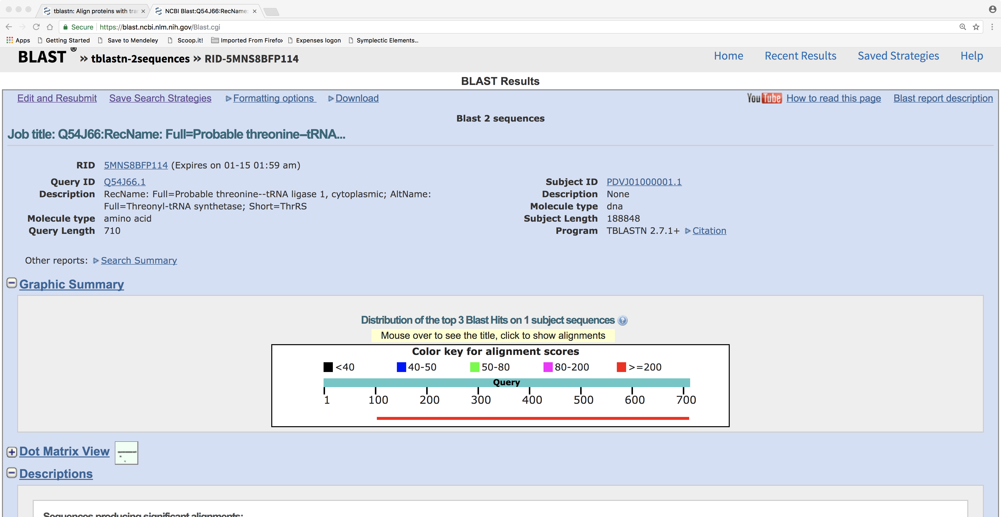 Notice that for the query you can insert either the actual DNA sequence or just the accession number. When you are ready, hit the “BLAST” button and wait for the results. By the way, if your patience is limited, you might wish to search against the Swiss-Prot database rather than the default database because searching this smaller database will be a bit quicker than searching the much larger one. On the other hand, searching against the smaller, less-comprehensive database might yield less information. So, you could try both (in different tabs in your web browser).