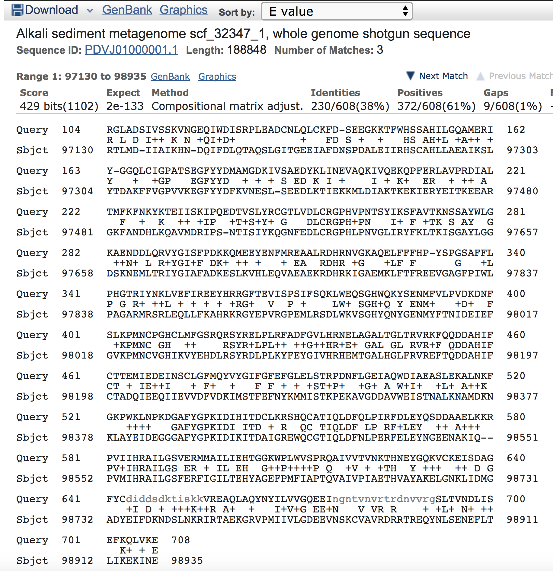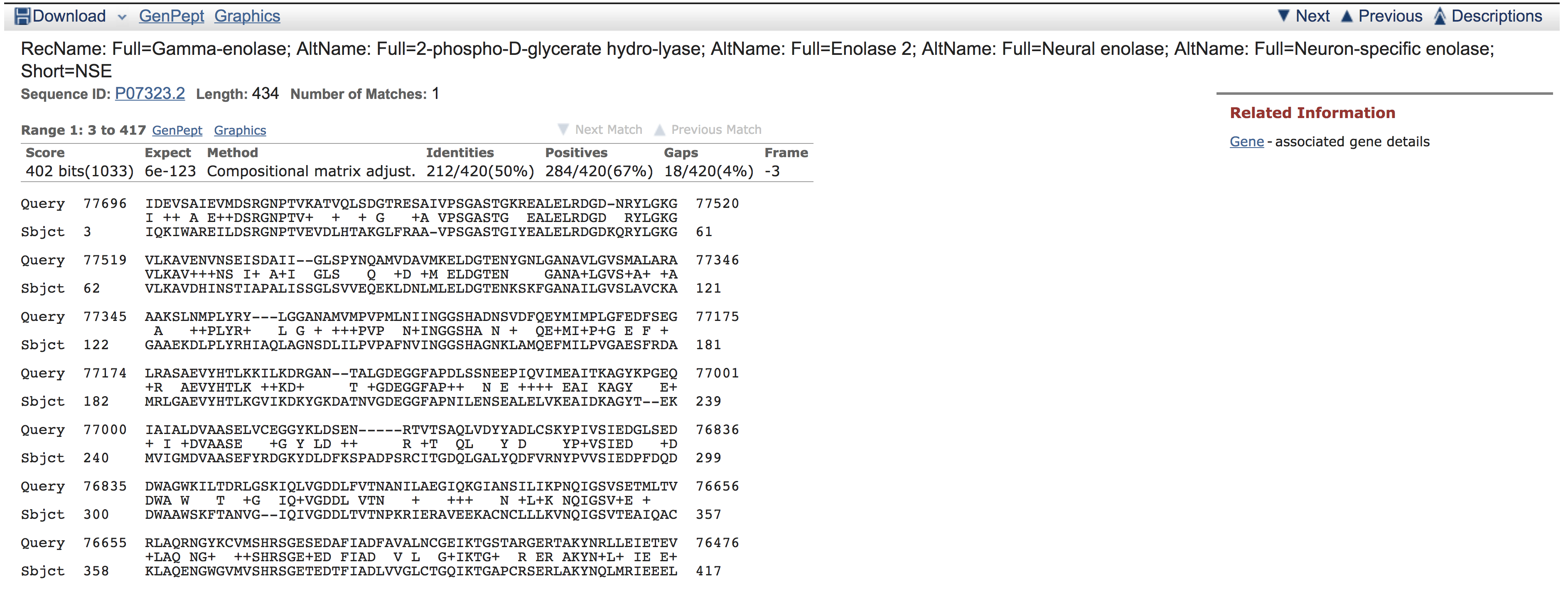 This clearly shows that about 85% of the query protein’s length has detectable sequence similarity with our query DNA sequence. Now if we scroll down we can see the sequence alignment:
