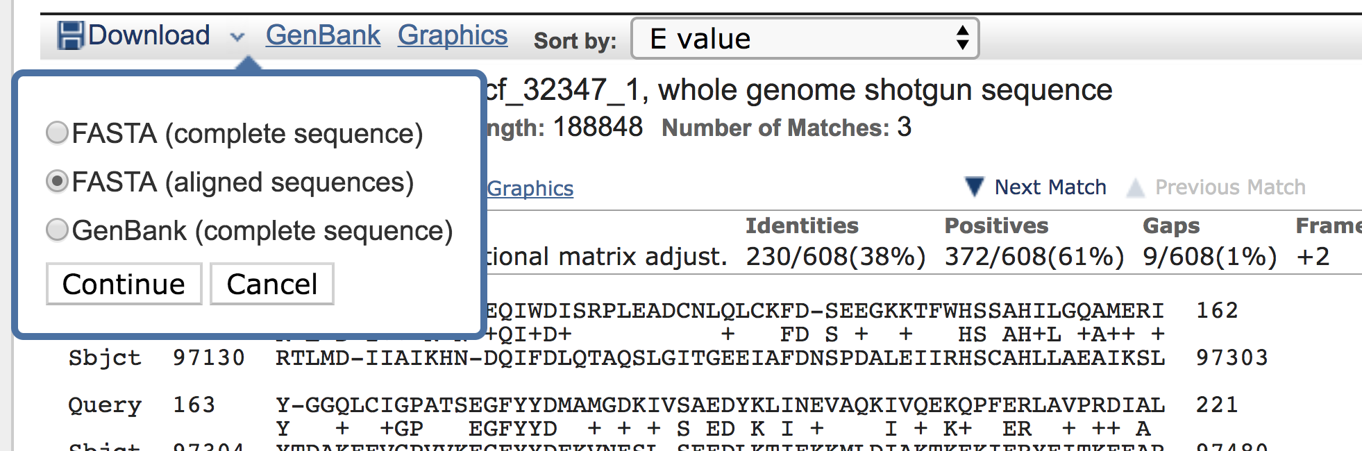 We are now going to perform a series of steps in order to extract the DNA sequence of our newly discovered gene. Note that this gene sequence is a substring of the original query DNA sequence that we started with. In other words, the protein-coding gene sequence occupies only a small part of the genomic DNA sequence; their might be other genes elsewhere in the DNA sequence. In the example above, our gene lies around positions 76,476 and 77,696 in the original 188,848-bp sequence.