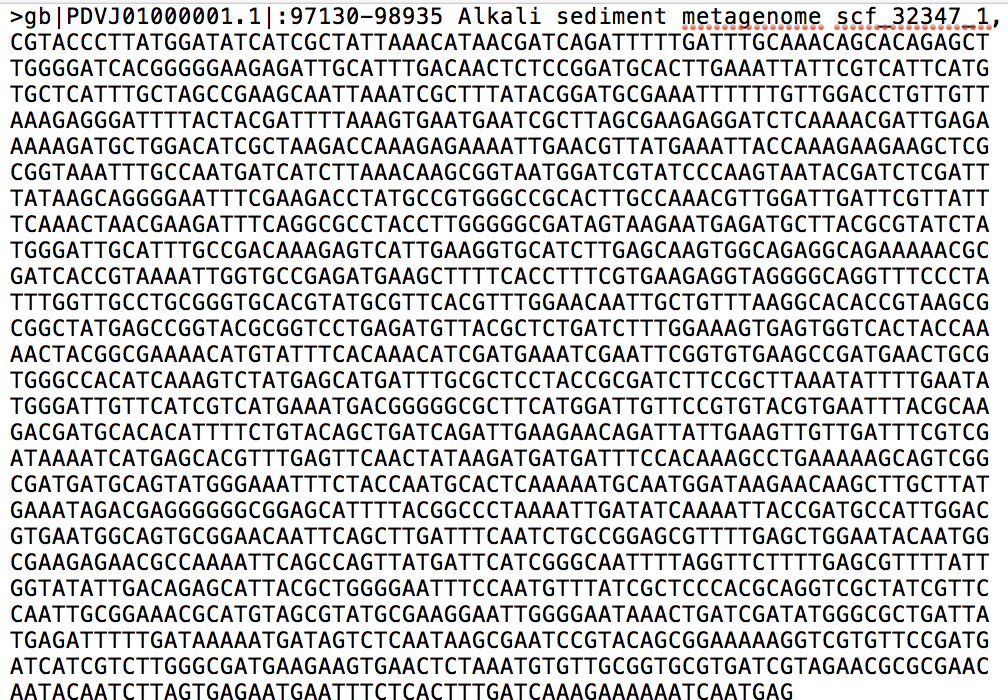 Notice that this contains just the sequence of the actual gene and we have discarded the non-coding DNA sequence from upstream and downstream of the gene. We can now perform analyses on this gene without confusing or confounding results arising from the up- and downstream flanking sequences.